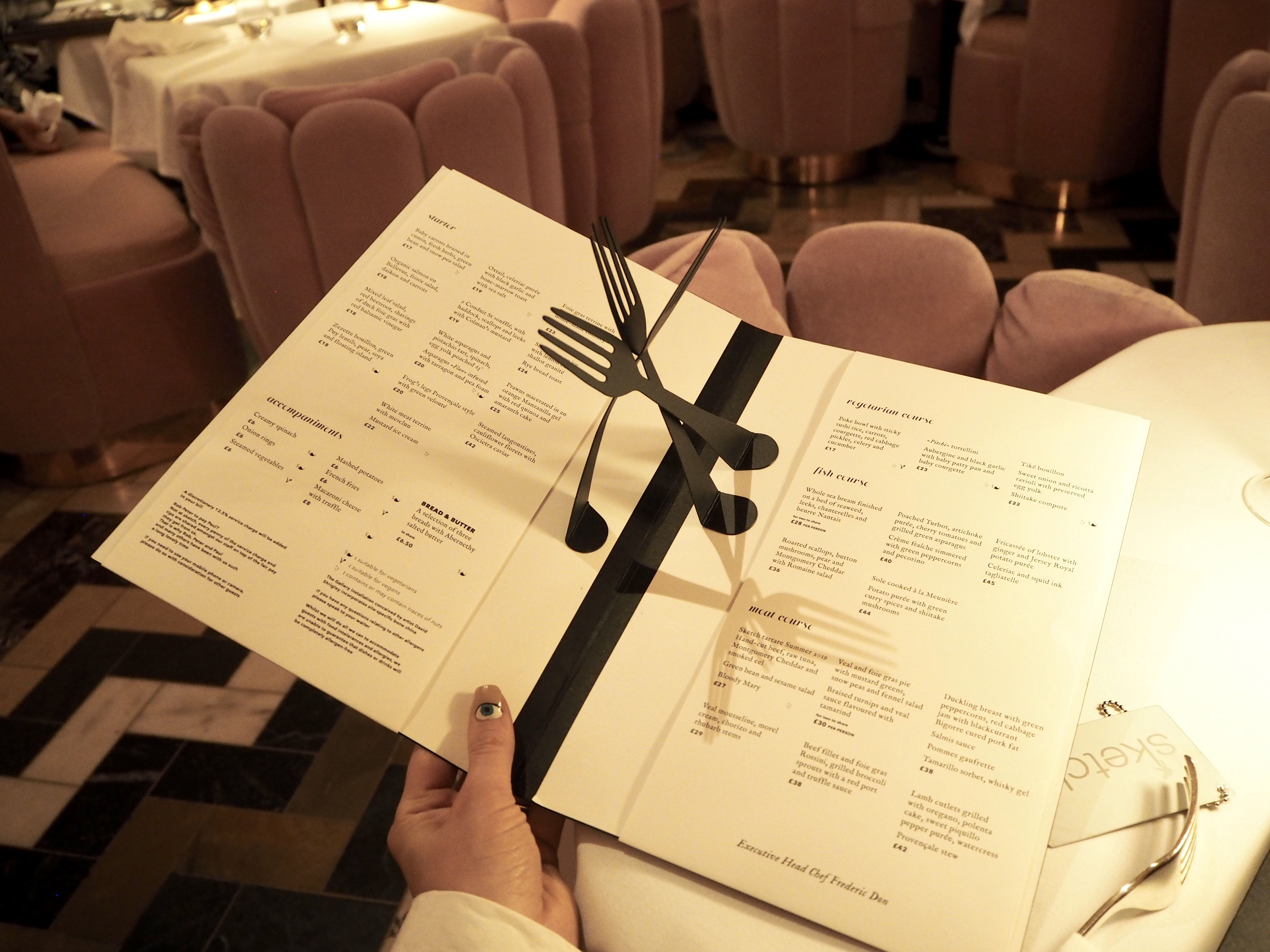 Altså hvor skal jeg starte, dette er noe av det villeste mine øyne har sett av en restaurant. Det minner mere om ett museum med disse vakre rommene som vi ble tatt igjennom. Sketch består altså av en restaurant (det rosa rommet), tre helt ulike og spennende barer og ett toalett som er så lekkert at jeg kunne blitt der hele kvelden, helt rått! Det var veldig staselig ar LoveGreatBritain tok meg hit, jeg har alltid ønsket og tenkt at jeg skal besøke Sketch men så har jeg altså aldri kommet meg hit før nå. Å spise her er ikke bare ett godt måltid men en hel opplevelse med alt fra de morsomme menyene til detaljer på tallerker og servietter. Servicen er selvsagt i toppklasse i de uforglemmelige kule og kunstneriske omgivelsene. Jeg håper det ikke blir alt for lenge til jeg skal hit igjen!